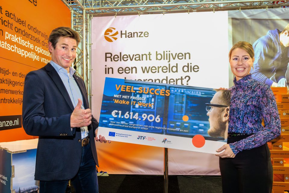 De symbolische cheque werd tijdens de Promotiedagen overhandigd door wethouder Carine Bloemhoff aan Robin van den Berg, directeur van de IT Academy Noord-Nederland, en Marion Koops, projectleider van Make IT Work. Make IT Work is een omscholingstraject, gelanceerd in 2019 met steun van EFRO-subsidie. Het traject schoolt cursisten om, zodat zij aan het werk kunnen in de IT-sector.