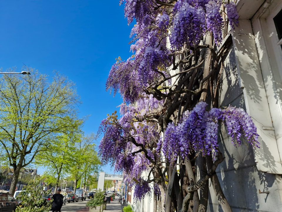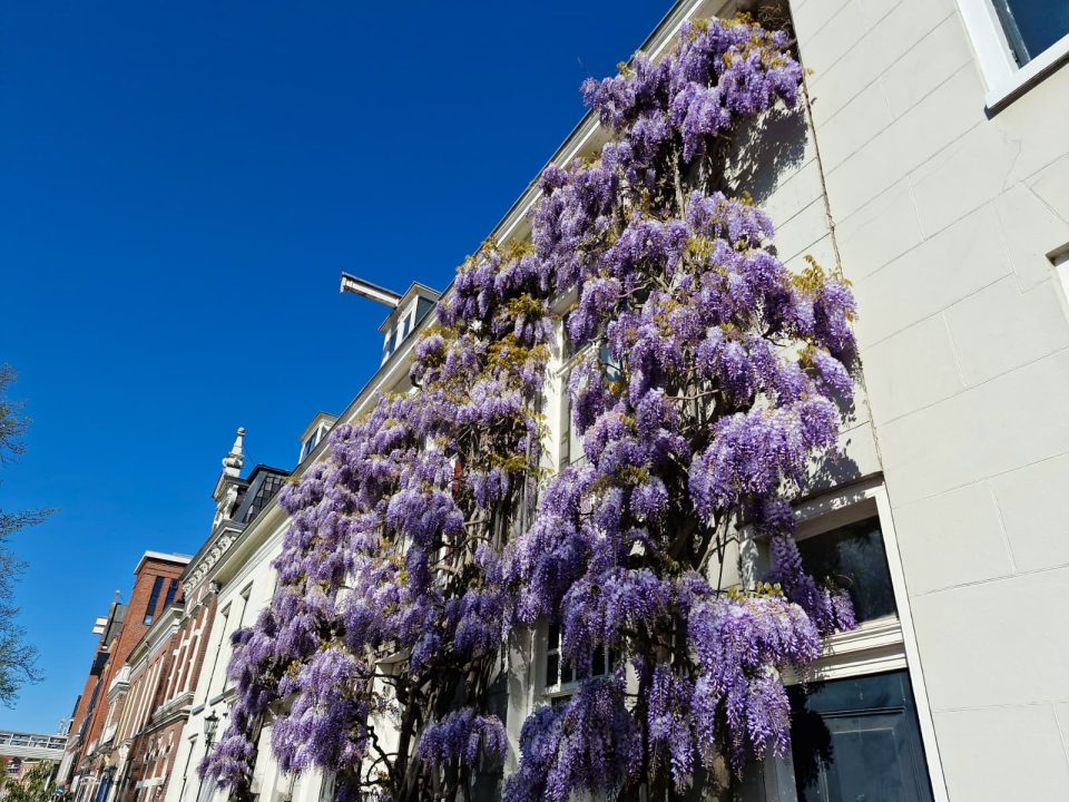 De blauwe regen werd vermoedelijk in 1905 geplant, en daarmee is de indrukwekkende plant nu ruim 120 jaar oud. Wie er langs loopt of fietst, móet wel even kijken, want je kunt er niet omheen. Aan de lopende band stoppen voorbijgangers om een foto te maken, en regelmatig zijn er zelfs hele fotoshoots van mensen die bij de lila trossen poseren.