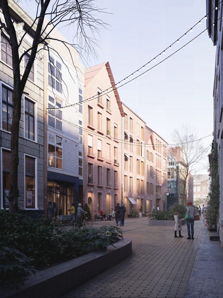 In het ontwerp van MWPO komt er plek voor zo’n 45 woningen voor gezinnen, starters en senioren. Ook komt er een open hofje, vol bomen en ander groen, en ruimte om te zitten. Op de impressie zie je daarnaast boogvormige doorgangen en aardekleurige stenen.