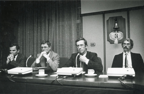 Roel Vos (tweede van rechts) in 1987. Tijdens deze bijeenkomst moest hij verantwoording afleggen over een iets te impulsieve uitspraak van hem dat Nieuwe Pekela ‘in de rimboe’ ligt. (Foto: Beeldbank, Groninger archieven).