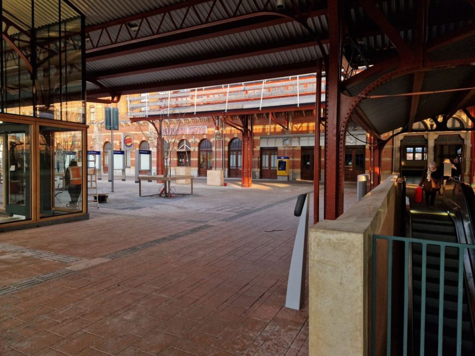 Wel liggen er nog grijze tegels tegen het stationsgebouw, maar dat is tijdelijk: eerst moeten de monumentale perronkappen op deze plek nog worden terug geplaatst. Zodra die klus erop zit, maken de tegels plaats voor natuursteen en het definitieve tegelwerk. Na deze werkzaamheden is de westzijde van het perronplein helemaal af.