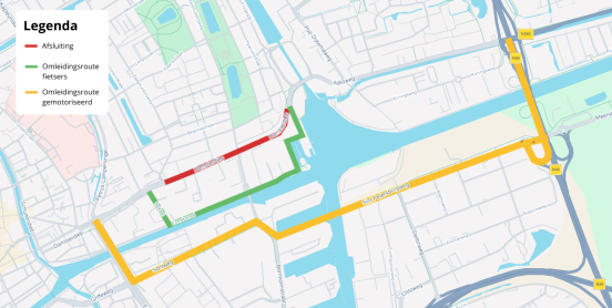 Vanwege de werkzaamheden is het fietspad aan de zuidkant van het Damsterdiep tijdelijk afgesloten. Fietsers worden omgeleid via de tijdelijk opengestelde kade van het Eemskanaal.