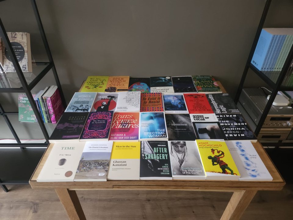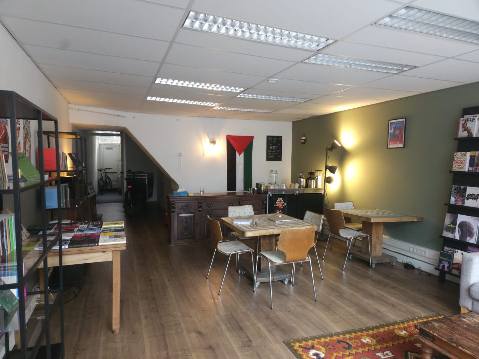 In plaats van posters staan er nu boeken in de etalage. The Hundred Years’ War on Palestine en Perfect Victims and the Politics of Appeal: de boodschap van Fugitive is eigenlijk heel simpel. Een samenleving waarin sommige mensen belangrijker zijn dan anderen, zal altijd groepen hebben die worden onderdrukt. Of dat nou queer personen of etnische minderheden zijn. Achter de bar van de zaak hangt een grote Palestijnse vlag. Aan Palestina is een hele plank gewijd. Ook is de boekenwinkel een ‘Apartheidvrije Zone’, een initiatief van de activistische beweging BDS Nederland waar Israëlische producten worden geboycot.