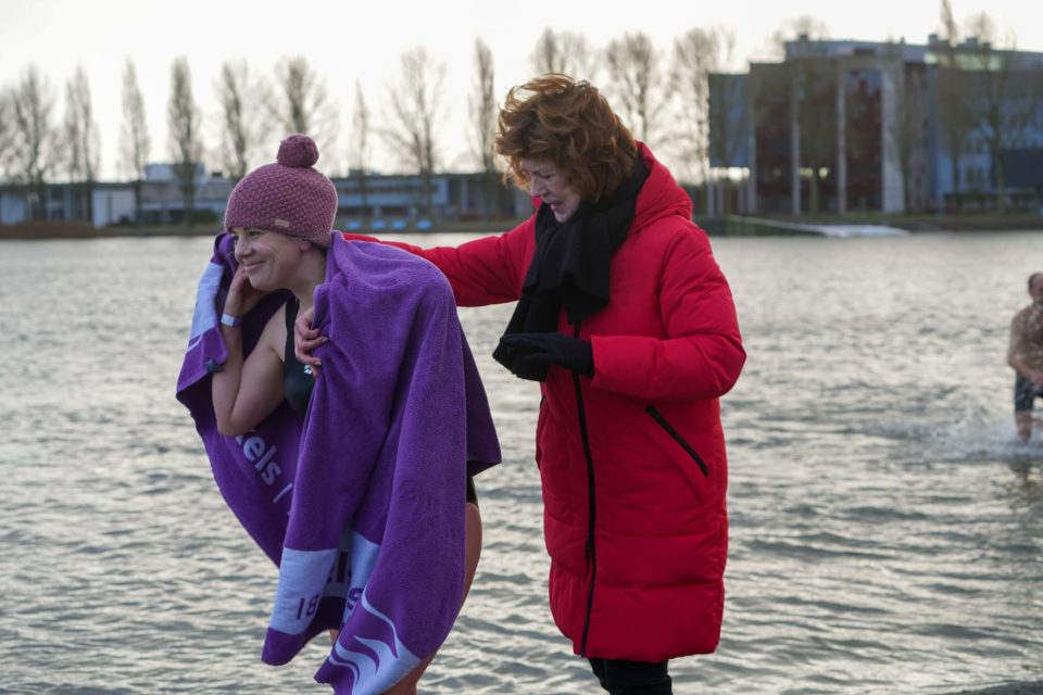 Alleen rennen of alleen dippen kon ook. Rond de start en finish troffen de deelnemers een gemoedelijke mix van sporters en supporters. Iedereen kwam met een rood hoofd en een brede lach weer uit het water.