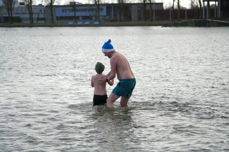 Een frisse, sportieve start van het jaar in het groen aan de rand van Groningen. Je loopt 2, 4 of 6 kilometer door het Kardingegebied met de stad op de achtergrond en duikt daarna het koude water in. Er waren een tiental deelnemers die de kou trotseerden.